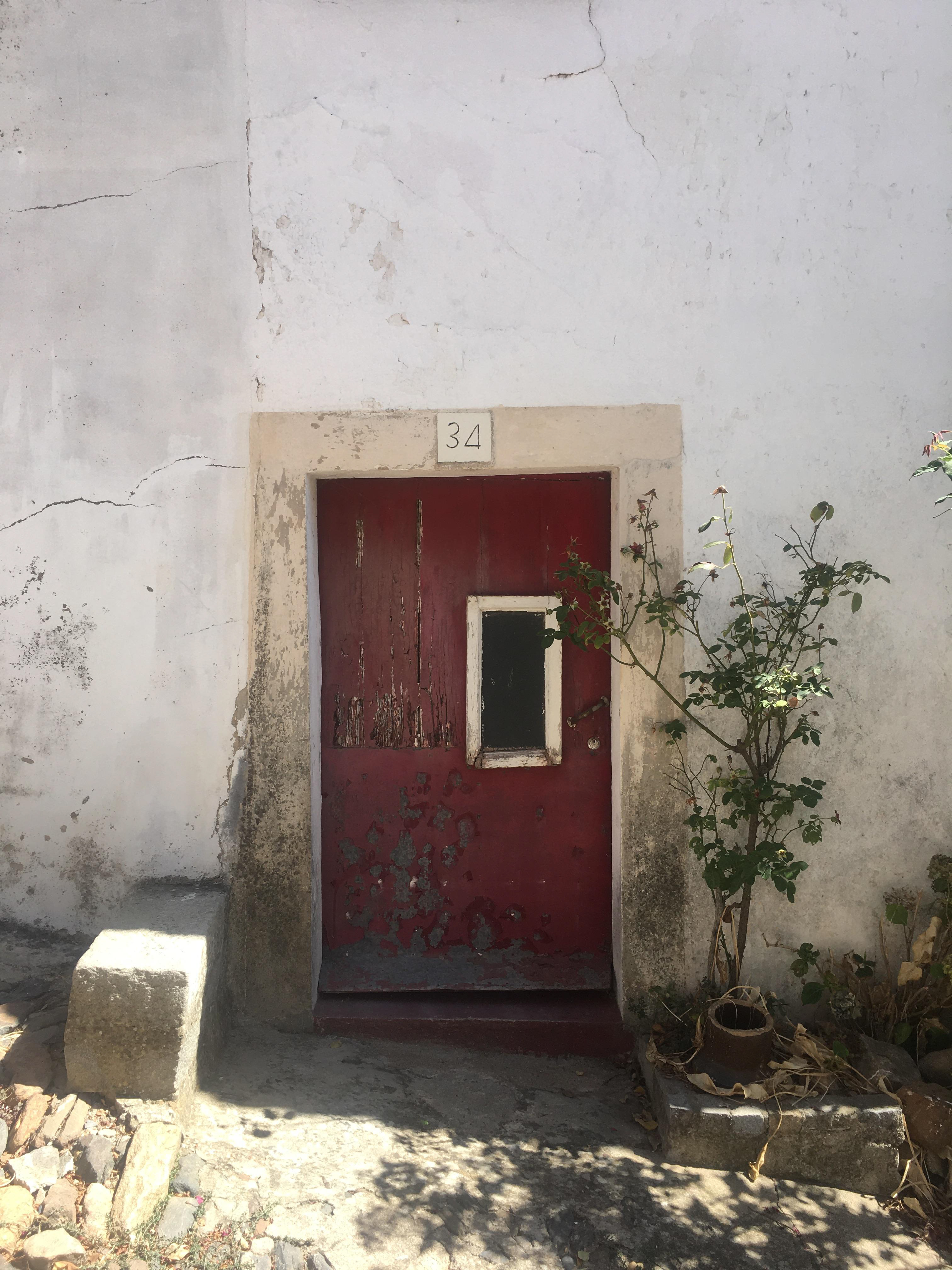 Uma casa com duas portas e duas janelas, confinada entre vizinhos numa rua com um acentuado declive na vila de Castelo de Vide.